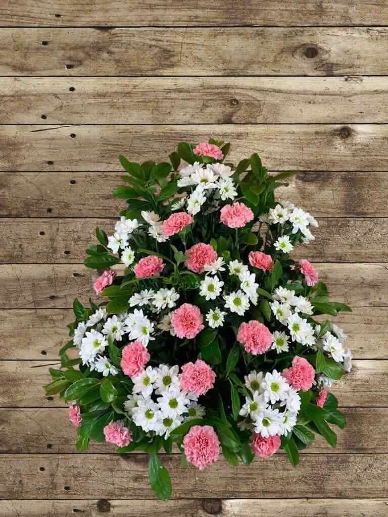 Descubre el Centro de Flores Bulnes, un arreglo floral sencillo y elegante con margaritas blancas y claveles rosados, ideal para expresar condolencias con discreción y cariño.
