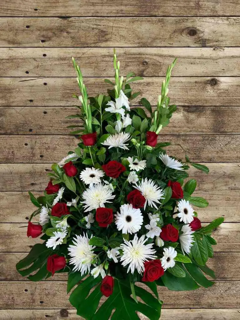 Descubre el Centro de Flores Cotiella, un elegante arreglo floral con anastasias, gerberas, gladiolos, rosas rojas y verdes ornamentales, ideal para expresar condolencias con respeto y distinciĂłn.