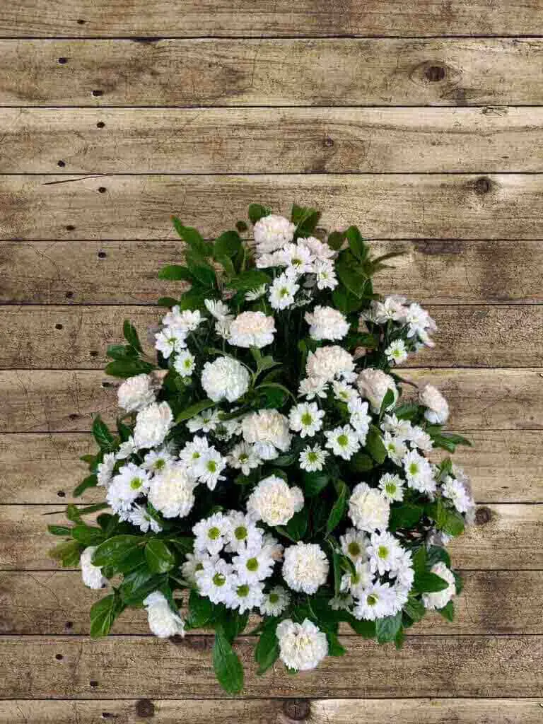Descubre el Centro de Flores Peñalara, un elegante arreglo con margaritas blancas, claveles blancos y verdes ornamentales, ideal para expresar condolencias con sencillez y respeto.