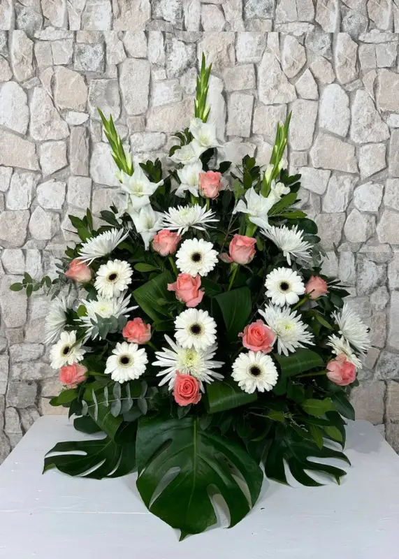 Nuestros centros están elaborados con flores de primera calidad, como rosas, lirios, claveles, gerberas, etc., y en una amplia gama de colores para que puedas elegir el que mejor refleje tus sentimientos. Todos nuestros centros llevan una cinta de condolencias con un mensaje personalizado.